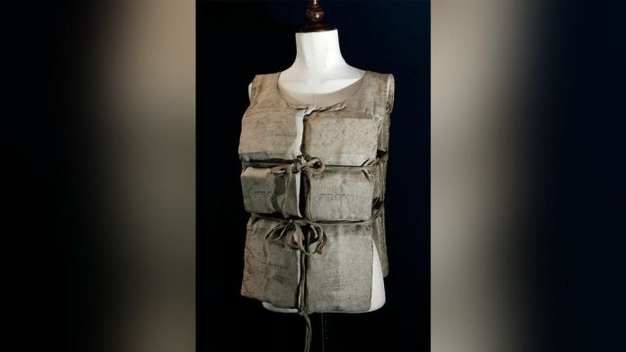 The cream-colored life jacket, made of canvas with cork-filled sections, has been displayed at museums in the United States and Europe.